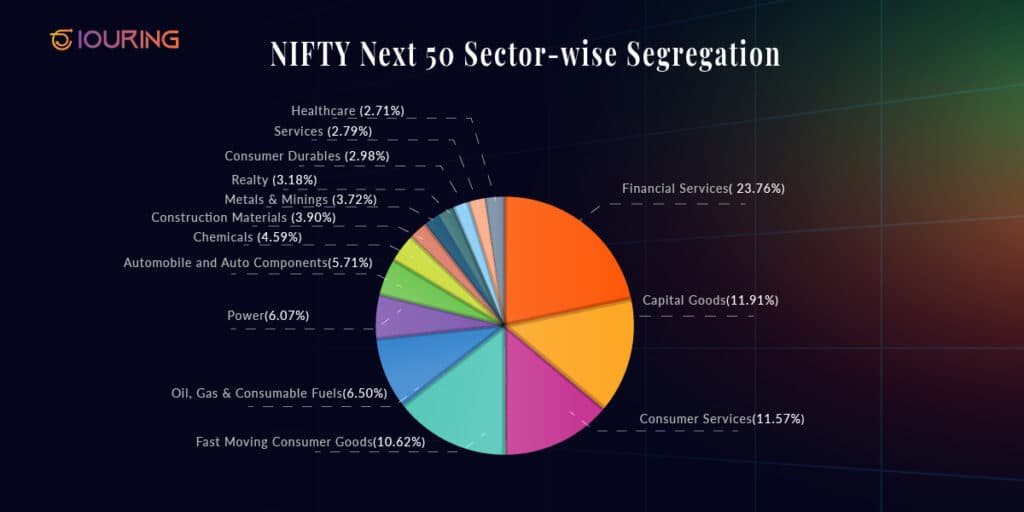 The Nifty Next 50, a comprehensive index on the National Stock Exchange (NSE), tracks the performance of 50 companies selected from the Nifty 100 index after excluding the top Nifty 50 constituents. These companies operate across 14 sectors, with Financial Services, FMCG, Metals & Mining, and Consumer Services comprising close to 50% of the index. Additionally, exposure to sectors like Oil, Gas & Consumable Fuels, Power, Capital Goods, Automobile and Auto Components, Consumer Durables, Chemicals, Realty, Construction Materials, Services, and Healthcare is available through the Nifty Next 50.
