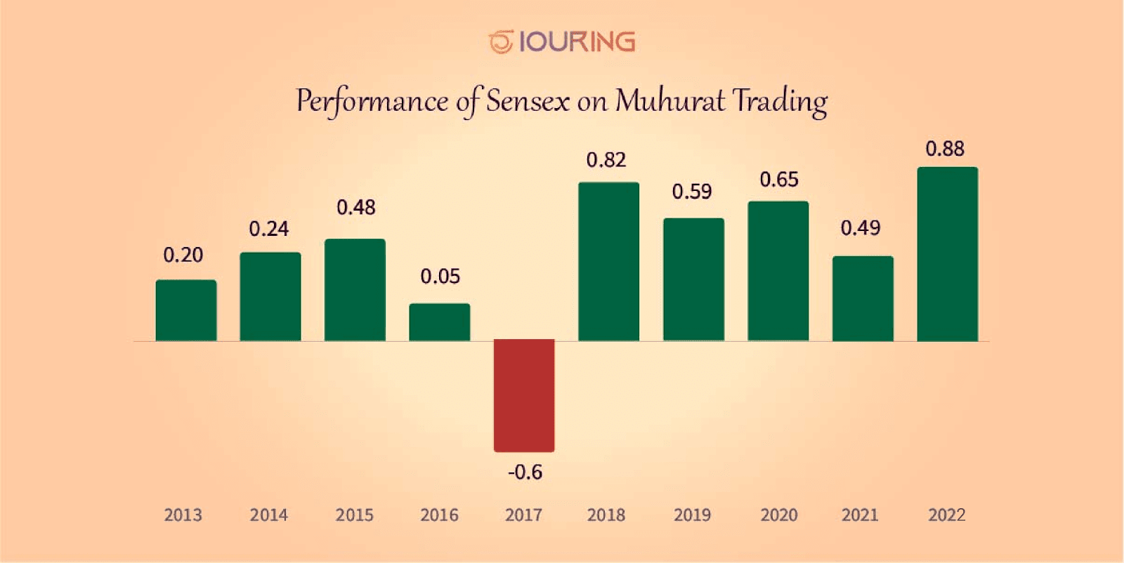 In 2008, the SENSEX index registered a record 5.9% growth on the auspicious day. Similarly, 2018(0.82%), 2019(0.59%), 2020(0.65%), 2021(0.49%), and 2022(0.88%) saw positive gains. Therefore, Muhurat trading has evolved and become an optimistic time for traders and investors alike.